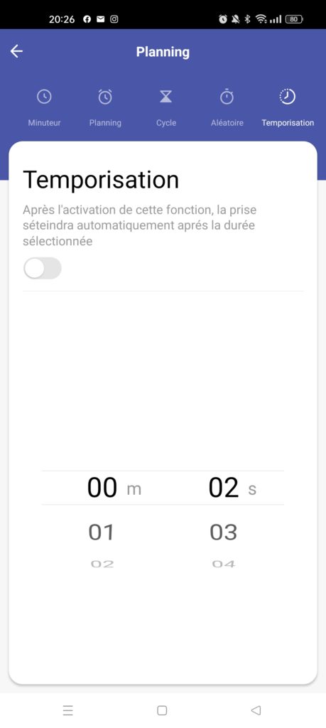 Choisir une temporisation qui permet d’alimenter la prise un temps défini, après avoir pressé sur le bouton d’allumage.
