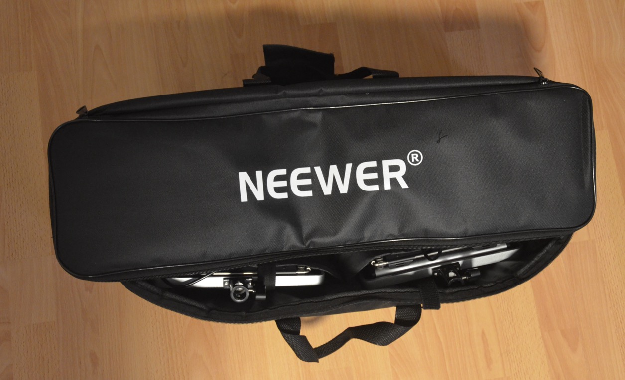 Qui-a-t-il dans cette boite ? Ne t’inquiète pas, Brad, je vais te le dire. On peut y retrouver un sac de rangement Neewer de bonne qualité qui contient tout ce dont nous avons besoin : Deux trépieds qui serviront à suspendre les deux panneaux LED, les câbles d’alimentation, les deux panneaux LED et, en petit bonus, deux diffuseurs de lumières pour obtenir un environnement un peu plus doux.