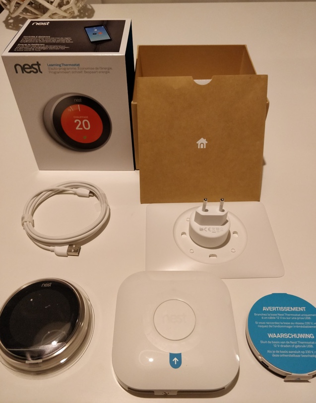 Comme à l’accoutumée chez NEST (voir le test de Nest Cam IQ), on découvre un packaging irréprochable. Chaque élément à sa place, on ne risque pas de satelliser le support en prenant le Thermostat ou perdre le set de vis fourni sous le canapé. Çà respire le sérieux, la qualité et l’étudié en profondeur. De plus, le coffret reçu pour le test comprenait également le support « table » très pratique si l’on veut éviter les trous inesthétiques dans le mur du salon… En résumé, NEST ne faillit pas du tout à sa réputation et les attentes sont bien comblées jusqu’ici…
