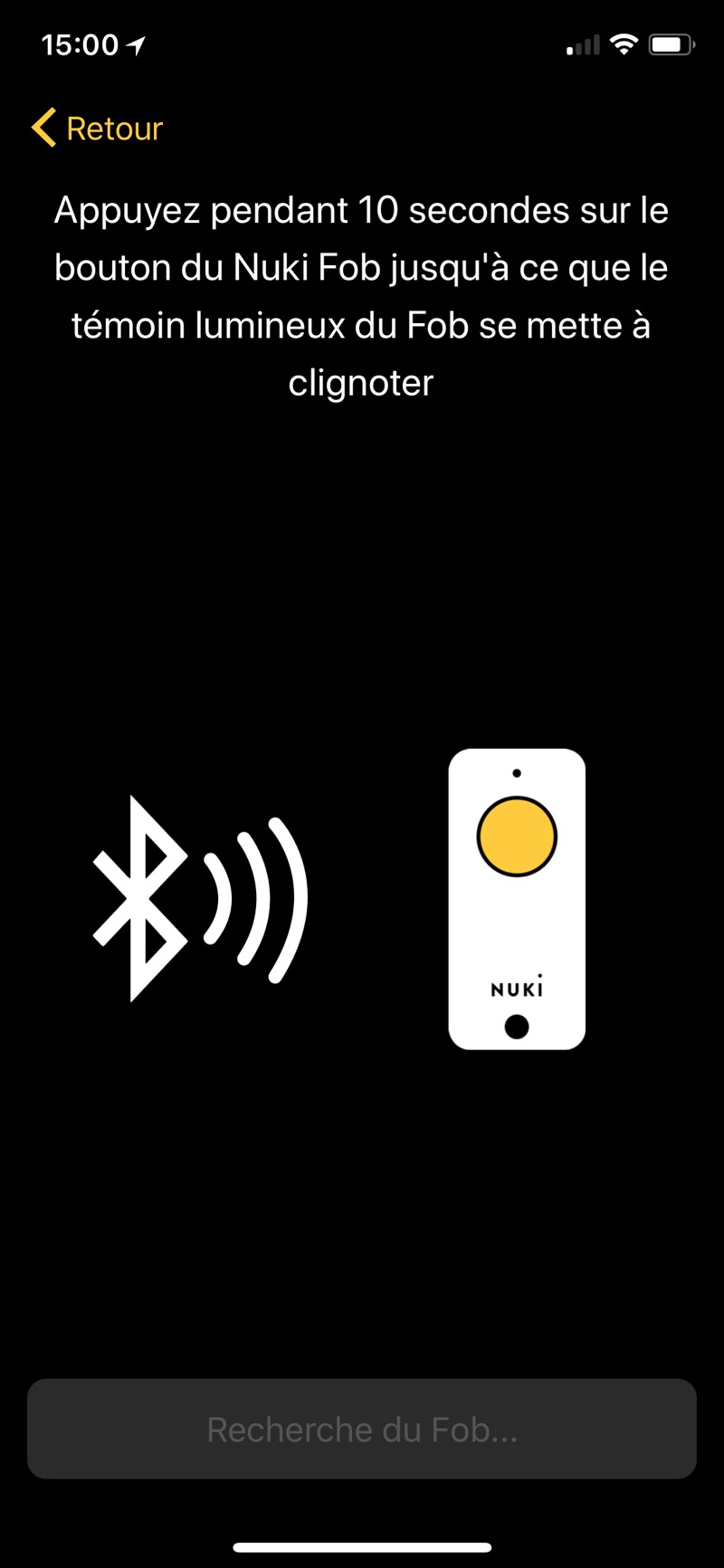 - Maintenez le bouton du porte-clés Nuki Fob appuyé pendant 5 secondes pour lancer le mode d’appairage.