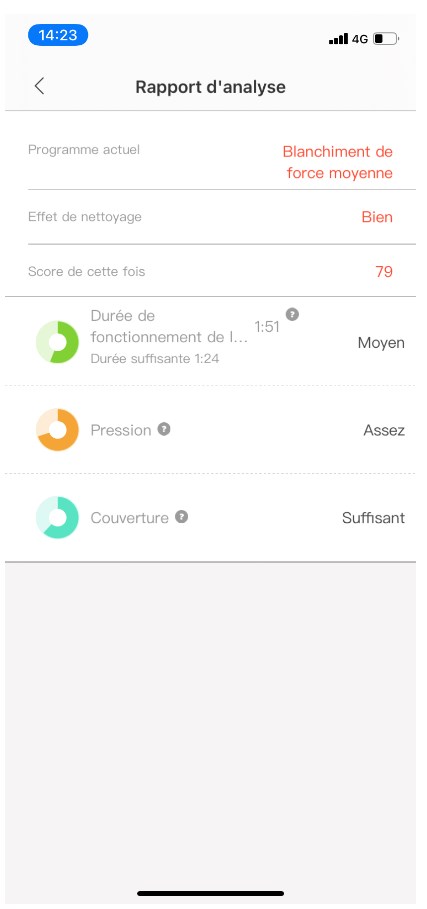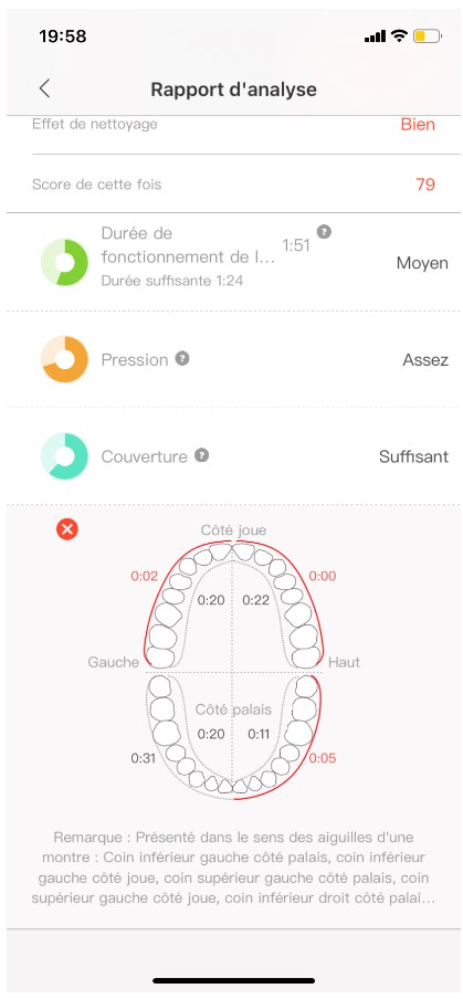 Après avoir passé 45 minutes à admirer les fonctionnalités de l’application, je trépignais d’impatience de me brosser les dents pour visualiser les analyses fournies. Quelques brossages plus tard, je m’aperçois que, finalement, se brosser les dents correctement est plus compliqué que je ne pensais. Grâce à la fonction « zones oubliées », l’application signale que j’oublie systématiquement des endroits difficiles d’accès et que la pression exercée n’est pas suffisante pour un brossage optimal.