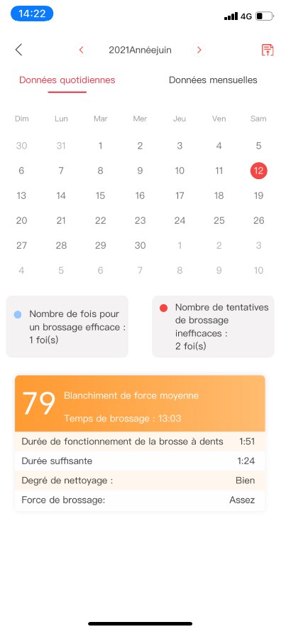 Les analyses de brossage sont reprises dans le calendrier (joliment traduit par « Histoire »), avec une vue quotidienne ou mensuelle. Le seul bémol est que l’application établi, apparemment, une moyenne par jour et ne permet pas de visualiser les détails de chaque brossage.