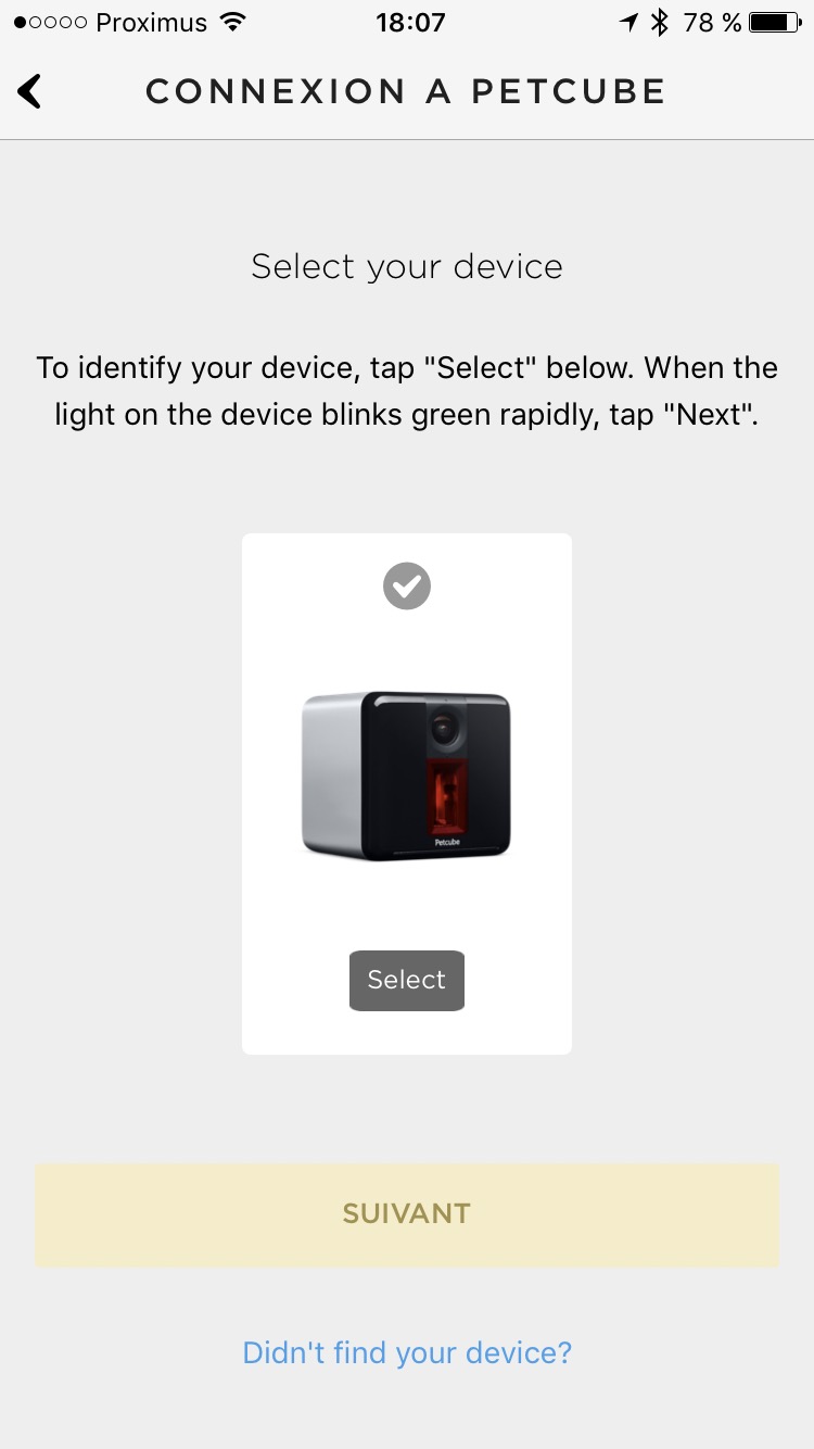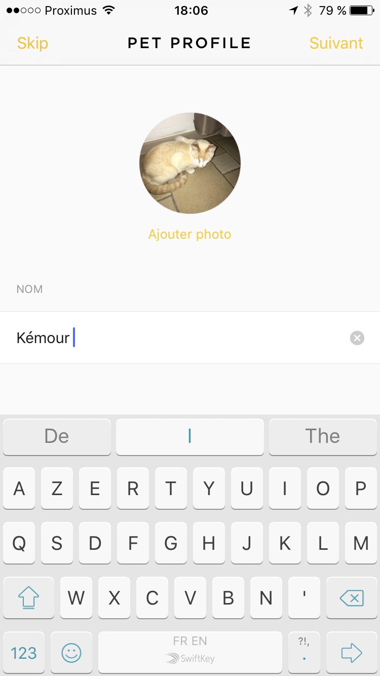 L’installation s’effectue au travers de l’App PetCube qui nécessite une inscription préalable au service. Personnellement, j’ai opté pour un enregistrement via Facebook et, en un clin d’oeil, je me retrouvais face à l’ajout d’une nouvelle caméra. Après avoir choisi le type de PetCube, choisi un réseau WiFi et entré la clé, ma caméra est fonctionnelle en un peu plus d’une minute. Difficile de faire plus simple et rapide. Accessoirement, on vous demande le type d’animal que vous souhaitez surveiller ainsi que ses caractéristiques (race, poids et photo de profil). De cette manière, mon chat Kemour pourra donc être vu sur le réseau social de PetCube. Bon, rassurez-vous, personne ne pourra jeter un oeil à votre intérieur tant que vous n’avez pas signé de votre … patte blanche.