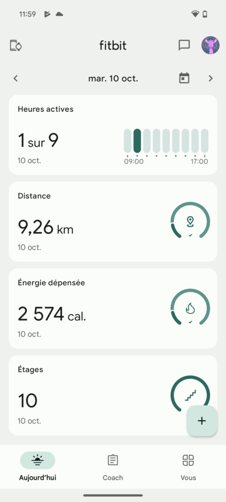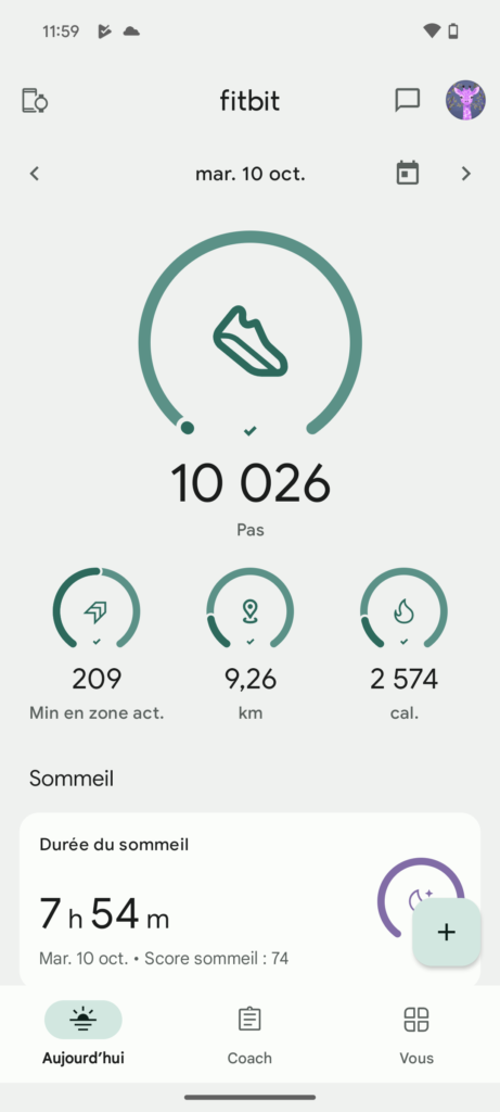 Je configure rapidement la Pixel Watch 2 dans son application dédiée et m’empresse d’aller re-découvrir l’app Fitbit. Je dis “re-” car je suis tombée dans le monde des montres connectée il y a quelques années avec la Fitbit Alta HR. J’avais adoré l’application, simple à utiliser et enrichissante, m’aidant à suivre mes activités quotidiennes. Ça, c’était avant de découvrir la richesse des stats que proposent d’autres marques. J’étais donc très curieuse de voir l’évolution apportée à Fitbit, avec quelques années de bouteilles supplémentaires, mais surtout suite à son rachat par Google.