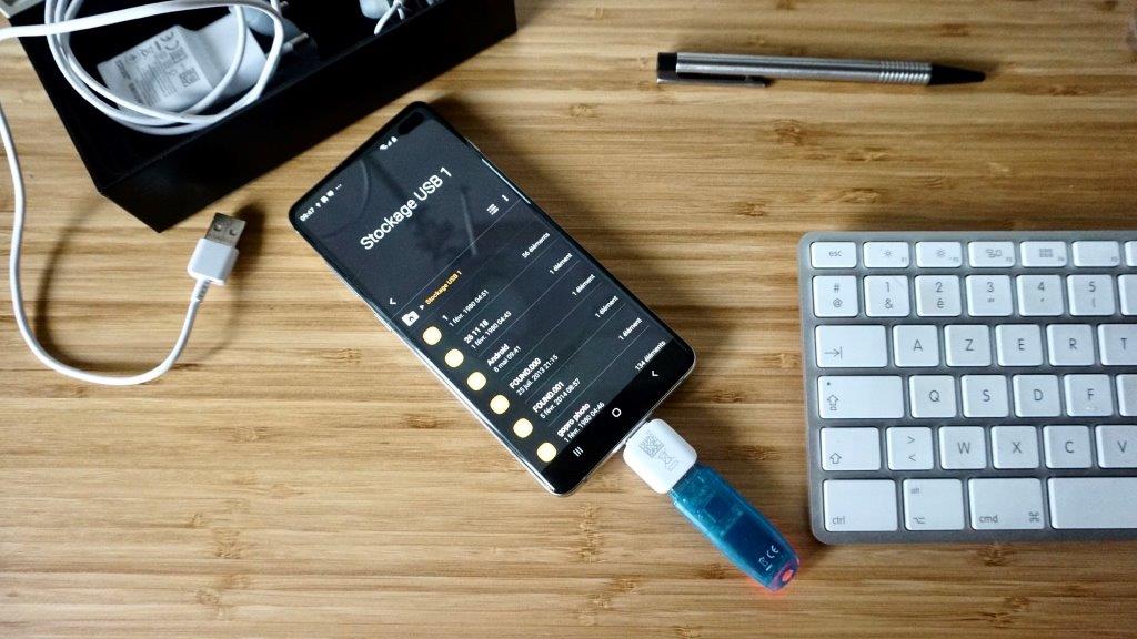 Au déballage, je découvre un S10+ Prism White arborant un design à tomber, offrant un sentiment de qualité au premier coup d’oeil. Ses lignes sont fines, son écran sans encoche est légèrement courbé sur les bords et son dos fait de verre, laisse apparaître 3 capteurs photos. Je remarque directement que Samsung a fait le choix de laisser une prise jack 3,5mm sur le dessous de l’appareil histoire de contenter les mélomanes amoureux du son filaire. En fouillant dans la boîte, je retrouve outre les écouteurs fournis, deux adaptateurs : un pour micro usb et un “classique” afin de pouvoir connecter directement une clé USB au smartphone, plutôt pratique !