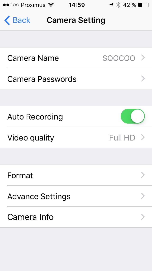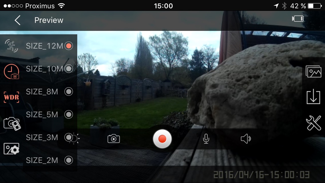 Petit détail fort intéressant, l’application iOS ou Android SooCoo fonctionne assez bien. Un appui long sur le bouton start/stop de la caméra vous permet d’activer le WiFi et il vous suffit alors de vous y connecter avec votre smartphone. Par la suite, votre téléphone peut être utilisé comme écran de contrôle, pour activer l’enregistrement et, surtout, pour accéder aux différents points de configuration de la caméra (résolution des vidéos, démarrage de l’enregistrement automatique dès que la caméra est allumée, etc.).