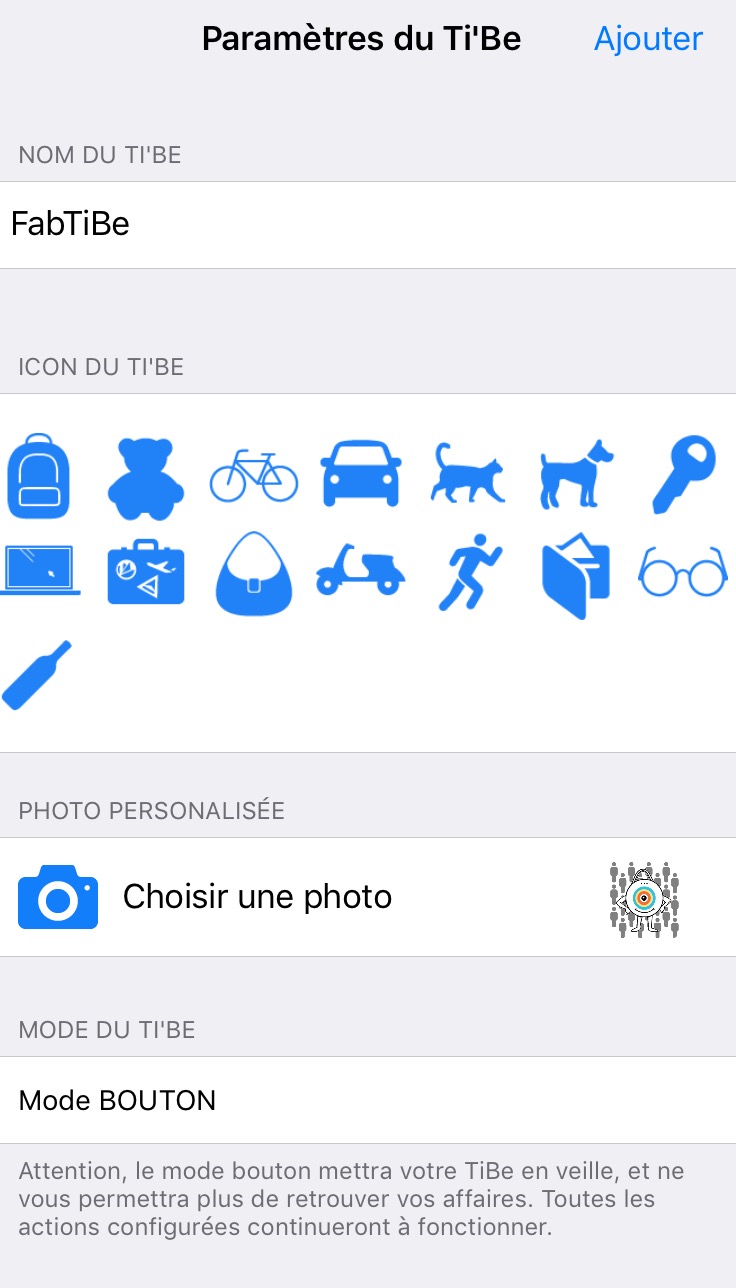 Vous retrouverez également une option ‘mode bouton’ qui met votre TiBe en veille pour économiser de la batterie avec pour conséquence de ne plus pouvoir enregistrer sa position en cas de perte. Par contre, les fonctions liées au bouton cible restent actives.