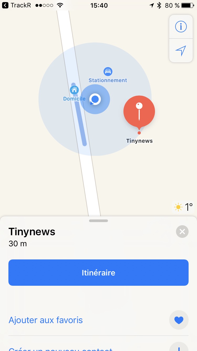 Pour ce qui est du “Trouve ma voiture“, c’est assez efficace. Comme expliqué précédemment, votre smartphone va enregistrer la dernière position connue de votre TrackR après perte du signal Bluetooth. Il vous suffira donc d’afficher ce point sur une carte et de vous laisser guider en avançant vers votre véhicule. C’est tout simple et vraiment pratique. Rien à redire.