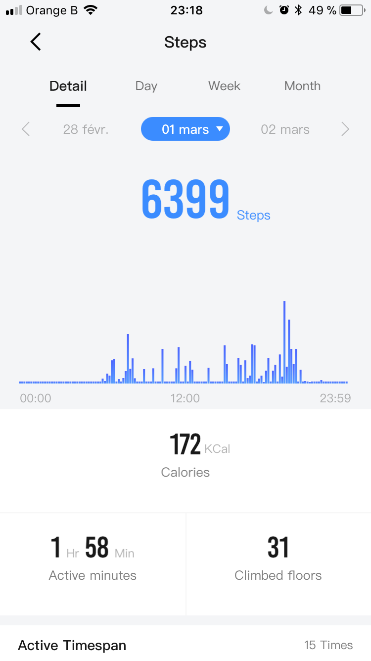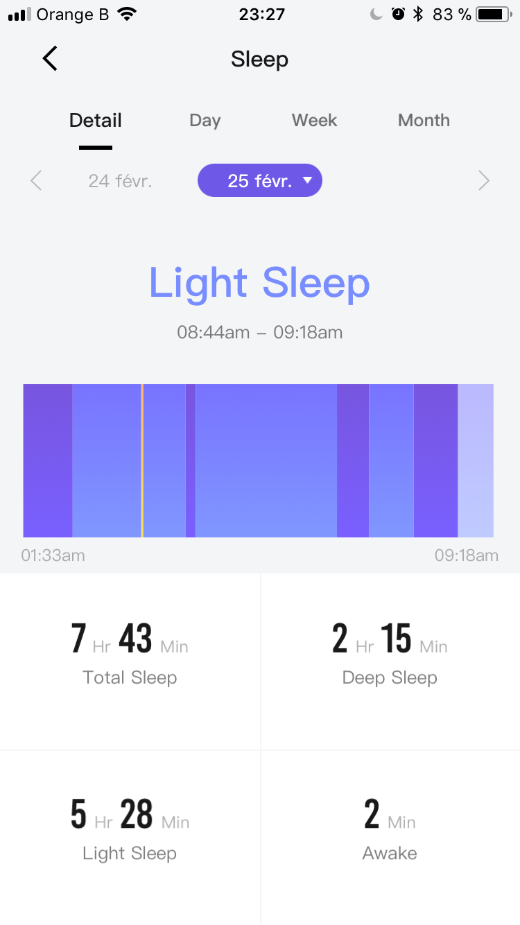 Ajouté à cela, on y retrouve aussi le pourcentage de batterie restante et l’analyse du sommeil. Bien sur, pour chacune de ces informations, il suffit de cliquer et vous aurez une analyse complète avec une vue détaillée par jour, semaine ou mois, ce qui permet de mieux suivre sa santé physique. Par exemple, grâce au suivi du sommeil, j’ai pu me rendre compte que j’avais de plus longues phases de sommeil profond lorsque j’allais me coucher plus tôt (avant minuit). À bon entendeur !