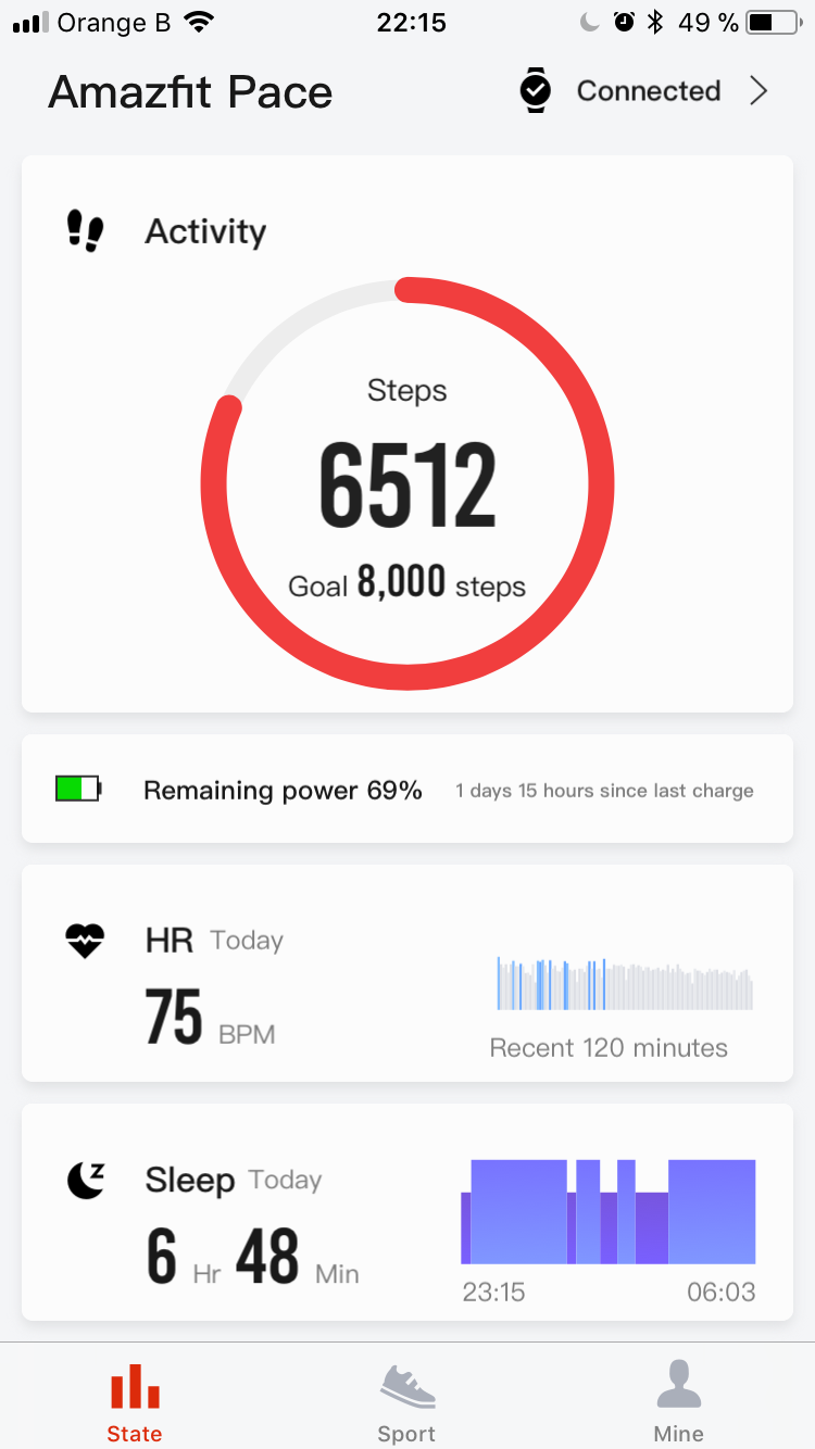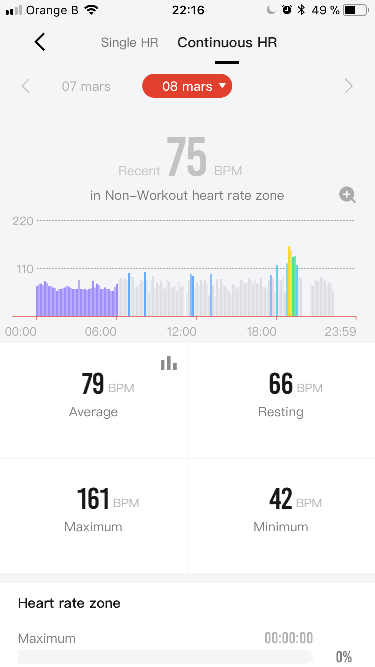 L’appairage se fait via le QR code sur l’écran de la montre et pour le reste, on se laisse guider ! Un premier écran donne le récapitulatif de la journée avec le nombre de pas, le suivi du rythme cardiaque si il est activé en continu. Personnellement, j’apprécie de voir comment mon petit coeur s’est porté tout au long de la journée.