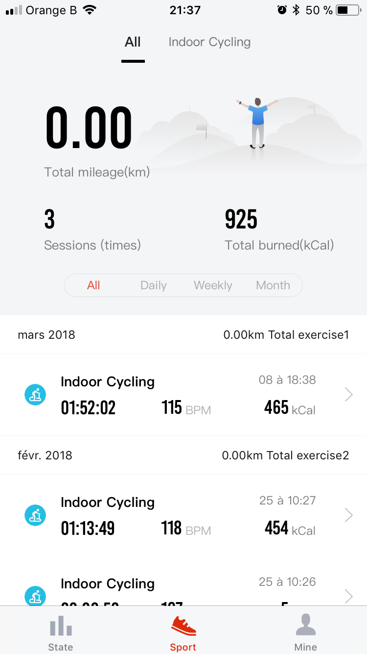 Le second écran reprend l’historique des activités sportives enregistrées directement à partir de la montre. Pour ma part, on retrouve mes cours de spinning avec toutes les infos intéressantes comme le nombre de calories brûlées (je sais comme ca si j’ai bien éliminé la barre chocolatée que j’ai avalée quelques heures plus tôt), le rythme cardiaque moyen et maximum atteint lors de l’activité sportive mais aussi les zones de fréquences cardiaques. Pour les activités prédéfinies dans la montre, je trouve le suivi et les informations très complèts. Par contre, je regrette de ne pas pouvoir simplement enregistrer une activité “cardio” comme c’est le cas sur certaines montres d’autres marques, cela m’aurait permis d’enregistrer par exemple mes cours de crossfit, qui du coup, ne sont pas dans mon suivi quotidien, c’est dommage.