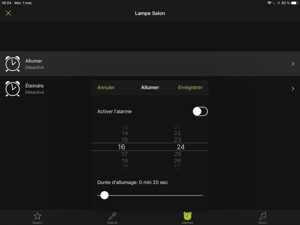 Une autre fonction intéressante est la programmation d’allumage et d’extinction des feux. Cette fonction peut en effet servir de simulateur de présence et possède de surcroît un réglage de durée de la phase d’extinction (fade-out) ou d’allumage (fade-in) pour une transition toute en douceur.