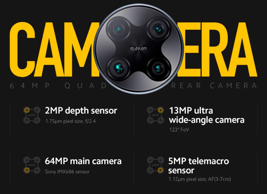 - Le capteur principal de 64 MPixels fourni par Sony et son capteur Sony IMX686 d’une ouverture de f/1.89 garantissant d’excellentes prestations en faible luminosité.