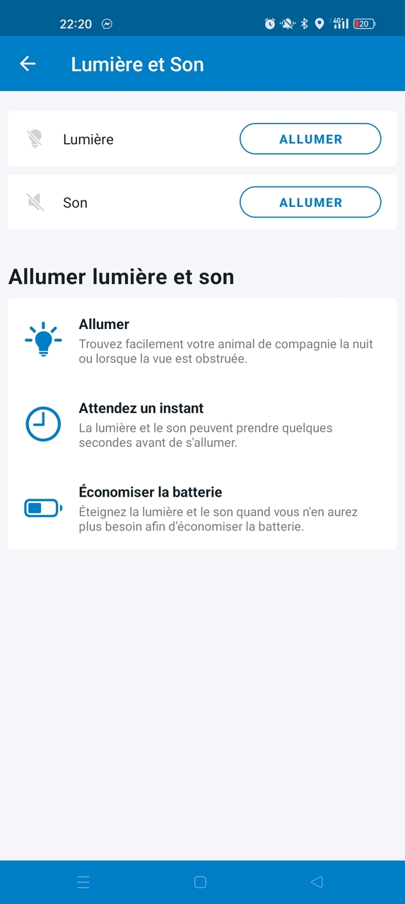 - Les son & lumière, qui une fois activés vous aideront à retrouver plus facilement votre animal (ou le traceur s’il s’est détaché)