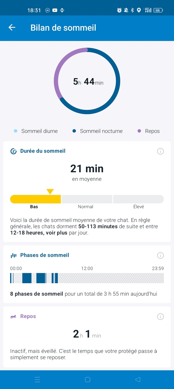 - La multitude de données relatives aux activités et habitudes de Koala comme la durée de sommeil, de repos, d’activité et de calories brûlées ; informations qui semblent inutiles de prime abord, mais qui sont très intéressantes pour suivre l’état de santé générale de son compagnon à 4 pattes.