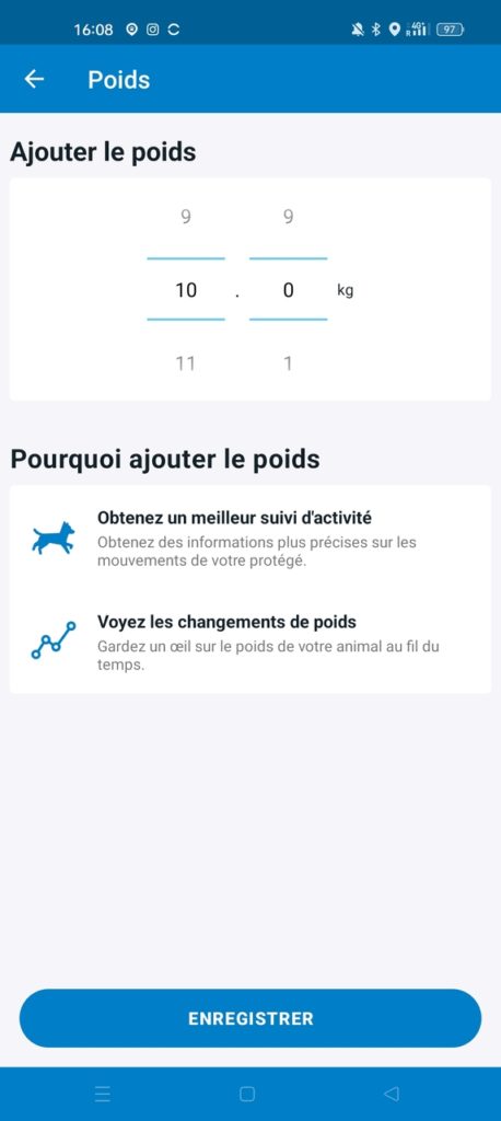 La connexion s’est passée facilement en suivant les étapes indiquées dans l’application. La première étape est d’encoder une série d’information sur l’animal qui arborera fièrement le traceur autour de son cou. Certaines sont requises pour le suivi de l’activité, même si je ne comprends pas vraiment pourquoi (race, taille, sexe, âge, mesure de la circonférence de la cage thoracique, longueur du bas de la jambe arrière, poids). Ces informations complétées, bonne nouvelle, le boîtier installe une mise à jour (j’aime les mises à jour, même si je ne sais pas ce qu’elles font, j’ai l’impression que le boîtier sera meilleur). Je ne m’attendais pas à une application aussi complète et aussi bien développée pour un traceur d’animaux. J’ai été très agréablement surpris !