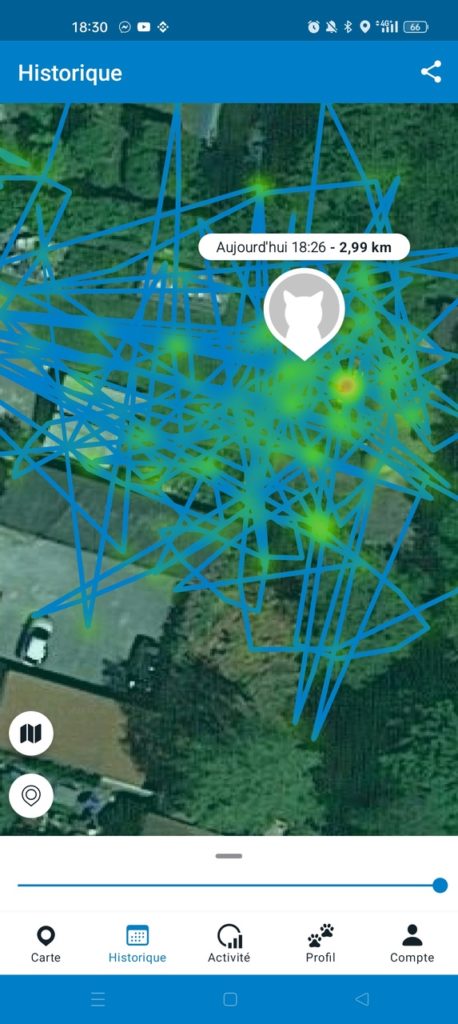 - L’historique de déplacement, qui permet de connaître les endroits que l’animal a l’habitude de fréquenter. Information pertinente si la batterie est plate, afin de diriger les recherches dans les zones habituelles.