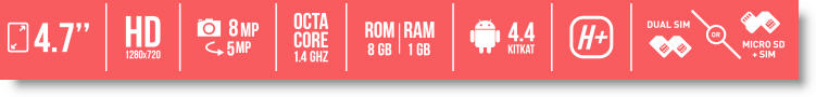 Ce nouveau modèle offre un bel écran IPS de 4,7 pouces avec un résolution de 1 280 x 720 px. Son processeur, un SoC MediaTek huit coeurs, est épaulé par 1 Go de RAM et 8 Go de mémoire interne. Un port microSD est disponible pour étendre la mémoire de stockage.