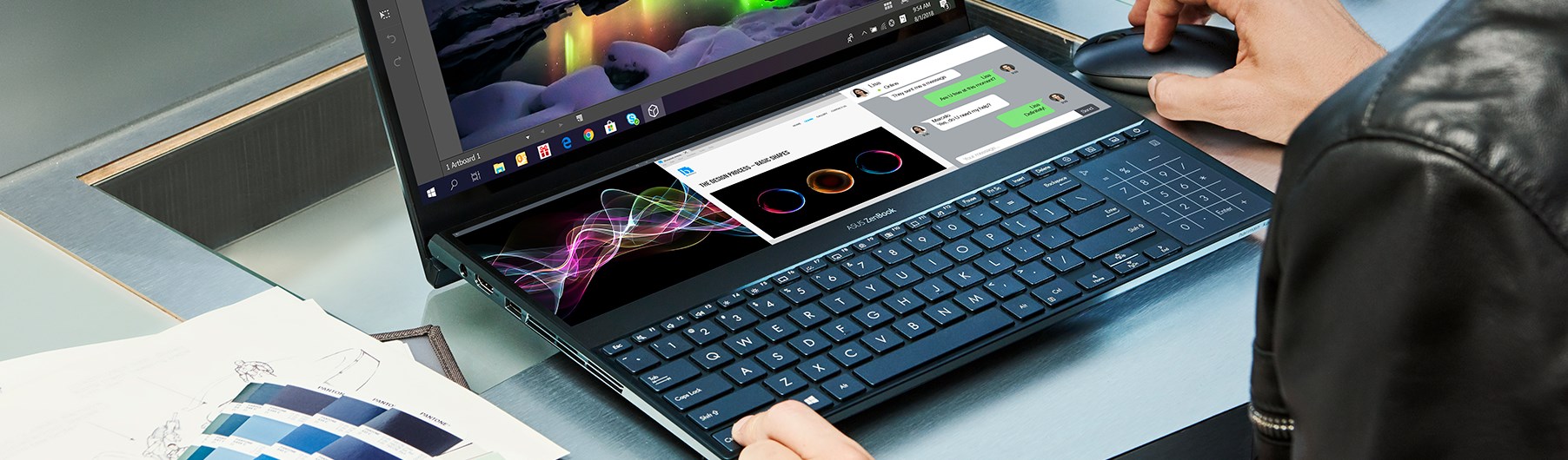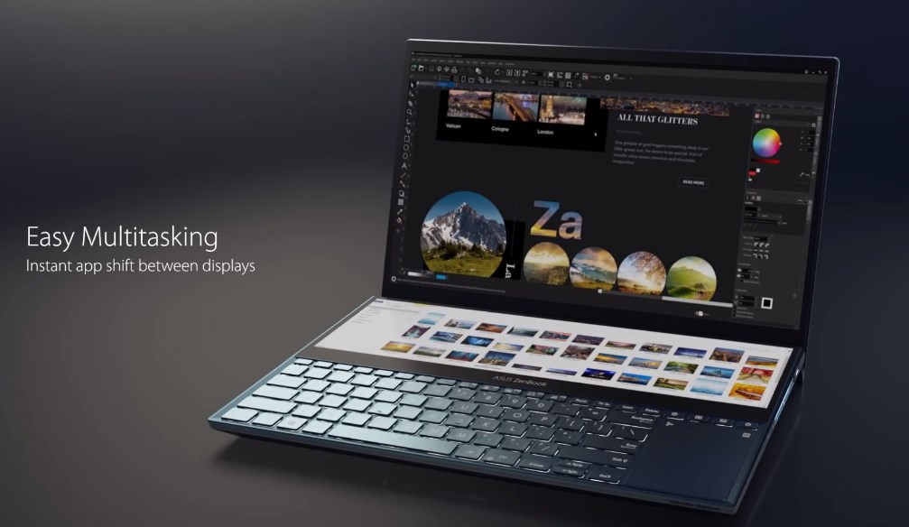 Ici, il n’est point question d’une “Touch bar” façon Apple mais bien d’une véritable dalle appelée “ScreenPad Plus“au format 32:9 qui viendra, sur la même largeur, s’intégrer au dessus du clavier et sous l’écran principal de 15 pouces. Il faut savoir que les deux écrans afficheront une résolution 4K de 3 840 x 2 160 pixels, tout en offrant un aspect tactile. Bien évidemment, l’écran principal ne dispose d’aucun bord et les deux dalles pourront, si vous le souhaitez, n’en faire qu’une seule afin d’optimiser au maximum votre espace de travail.