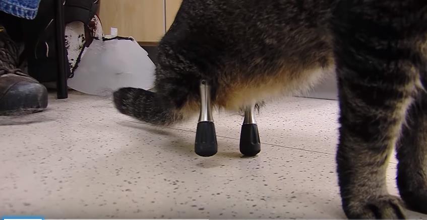 Le Dr. Mary Sarah Bergh, un professeur de l’institut de chirurgie de l’université vétérinaire de Lloyd (Iowa, USA), s’est associée à la société Biomedtrix afin de créer une prothèse de pattes en titane, permettant ainsi au gentil bipède estropié d’enfin de déplacer comme à peu près tous les félins.