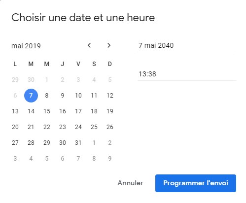 La solution idéale est donc de vous créer un compte Gmail et de rédiger votre message en n’oubliant pas le destinataire. Ensuite, ne cliquez surtout pas directement sur “Envoyer” mais bien sur la petite flèche dans ce même bouton “Envoyer”. Sélectionnez ensuite la date à laquelle le message doit partir et, hop, l’affaire est dans le sac.
