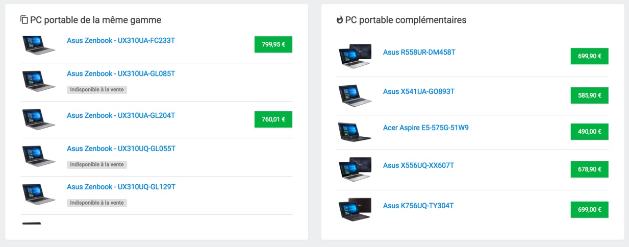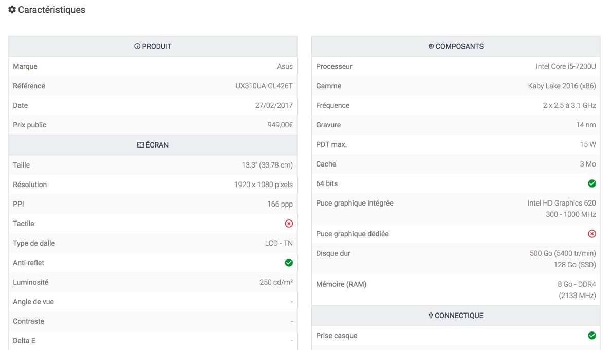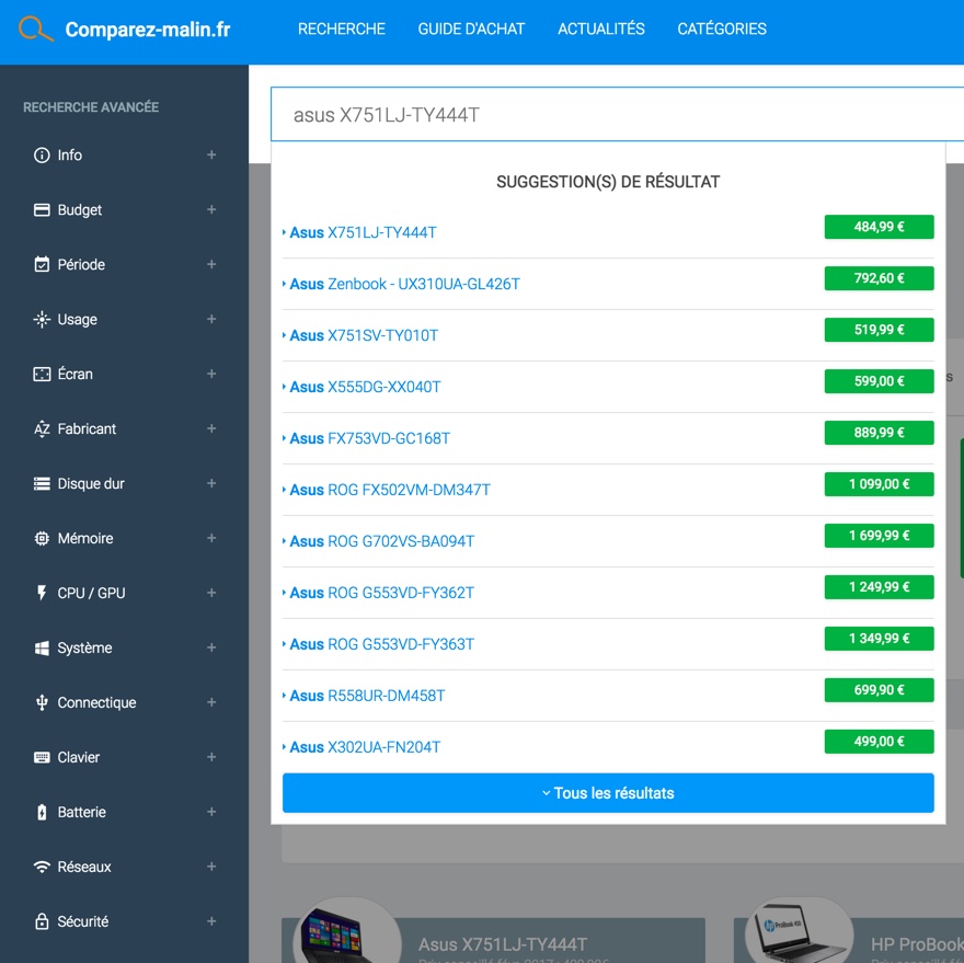 Déjà, le moteur de recherche semble complet et rapide. Le simple fait d’entrer “Asus Zen” vous renvoie une bonne brouette de résultats et vous trouvez en un clin d’oeil la référence du PC recherché. Une des grandes qualités du site est son exhaustivité en matière de fiches produits. Complet, bien agencé, il est donc inutile d’aller cliquer dix liens plus loin pour trouver un parfait descriptif  des spécifications de votre future bécane qui fera baver d’envie votre collègue, toujours enclin à trouver mieux que vous, en plus cher évidemment.