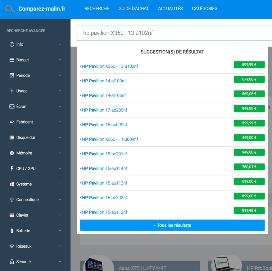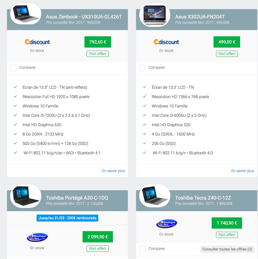 Il faut compter sur plus de 3000 références mises en vente sur une série de sites français. La catalogue peut se parcourir par catégorie, être filtré sur une belle série de spécificités (taille d’écran, marque, mémoire, disque dur, etc.) pour, au final, être certain de débourser le juste prix pour votre machine de rêve.