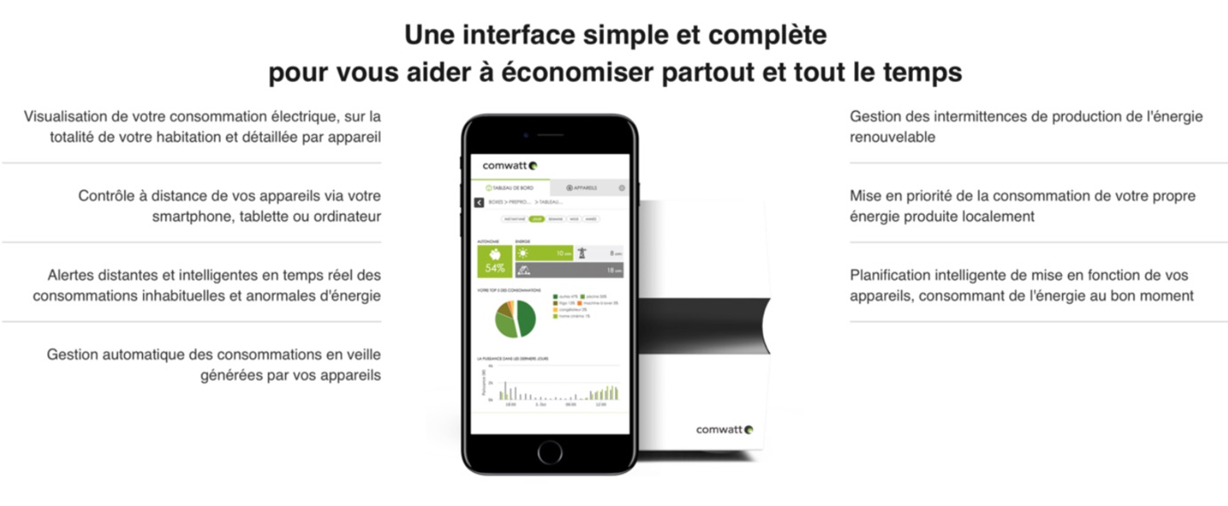 Les gestionnaires d’énergie de Comwatt vont permettre la coupure automatique des appareils en mode veille (qui représente 10% de la facture), une meilleure gestion des panneaux solaires (20% de réduction de facture sans Comwatt, jusqu’à 70% grâce à la box d’autoconsommation), de suivre en temps réel le montant de l’énergie revendu au réseau public. Les box d’autoconsommation solaire de Comwatt offrent un large éventail de fonctionnalités, offrant enfin à l’utilisateur le contrôle de son réseau électrique.