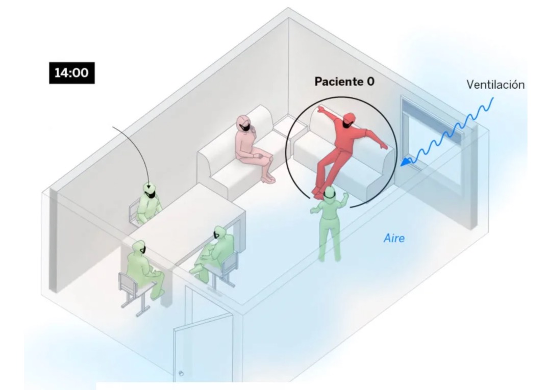 Ces aérosols, s’ils ne sont pas disséminés par l’aération, deviennent de plus en plus concentrés, ce qui augmente le risque d’infection. Les scientifiques ont démontré que ces particules, que nous libérons aussi dans l’atmosphère uniquement par la respiration et qui peuvent traverser les masques mal portés, peuvent infecter des personnes qui restent plus de quelques minutes dans un rayon de cinq mètres autour d’une personne infectée, selon la durée et la nature de l’interaction.
