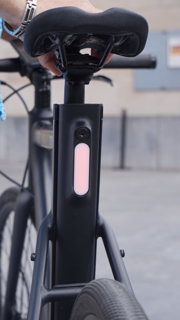 Un capteur de couple se cache dans le pédalier ce qui permet au vélo de s’adapter intuitivement à votre façon de rouler et aux difficultés de la route. Niveau sécurité, on retrouve un phare LED à l’avant et un à l’arrière qui, pour ce dernier, s’allumera telle une voiture lors de l’utilisation des freins (hydrauliques), très bon point donc !