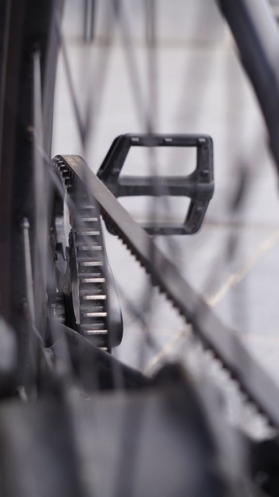 Côté innovation, je remarque directement que la chaîne du vélo n’est pas commune. Le Cowboy dispose d’une courroie en carbone avec pour avantages de limiter les entretiens, éviter les déraillements ou encore les traces de graisse sur le pantalon juste avant d’arriver au boulot.