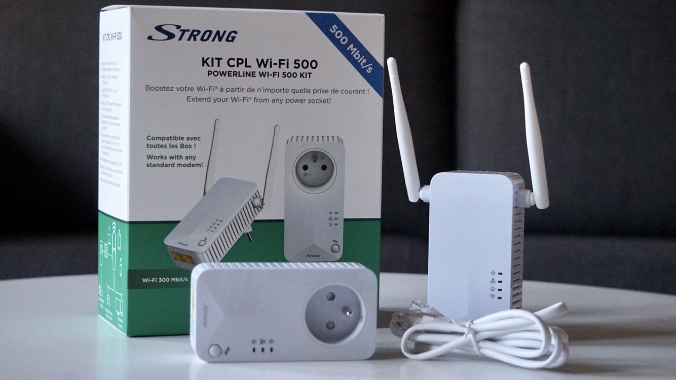 Le Kit cpl Wi-Fi 500 de Strong est livré avec un adaptateur “classique” pourvu d’une prise gigogne et d’un débit jusqu’à 500 Mbit/s ainsi qu’un adaptateur Wi-Fi d’un débit jusqu’à 300 Mbit/s (celui avec les antennes) tous deux équipés de connecteurs Ethernet (RJ45) . Ils sont compatibles HomePlug et fonctionnent avec la majorité des routeurs et autres box internet standards. La portée des CPL peut atteindre 300 mètres via les câbles électriques. Le tout est livré avec un mode d’emploi pourvu de quelques images tout à fait suffisantes pour le placement.
