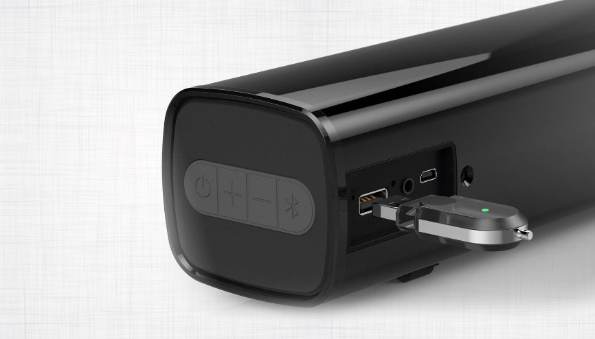 Il est à noter que la barre se transforme en enceinte Bluetooth en un coup d’œil, en proposant une autonomie maximale de 6 heures. Aussi, un port USB classique est présent afin d’y connecter une clé bourrée de MP3. Sur la partie latérale se trouve les boutons volumes, le on/off et l’activation du Bluetooth 4.2.