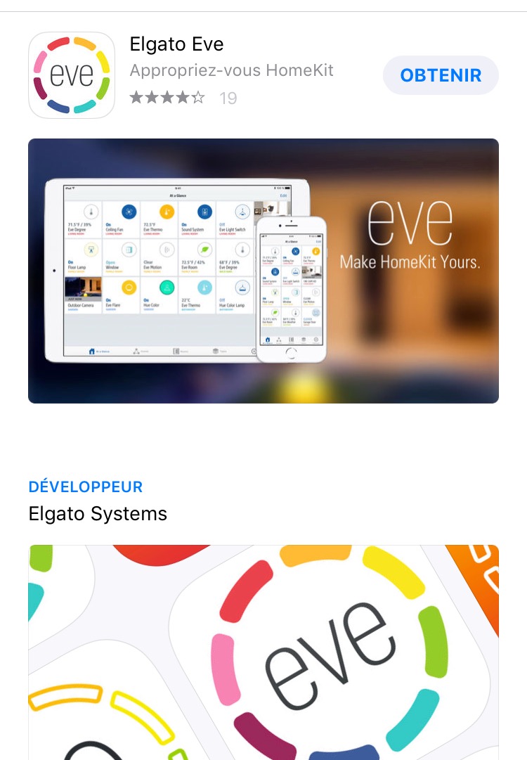 L’application Elgato Eve, disponible sur l’App Store, offre l’avantage de pouvoir gérer l’ensemble des produits de la marque. Le jumelage se fait en douceur en 2-3 clics sans devoir lire ou comprendre un quelconque manuel d’installation rapide.