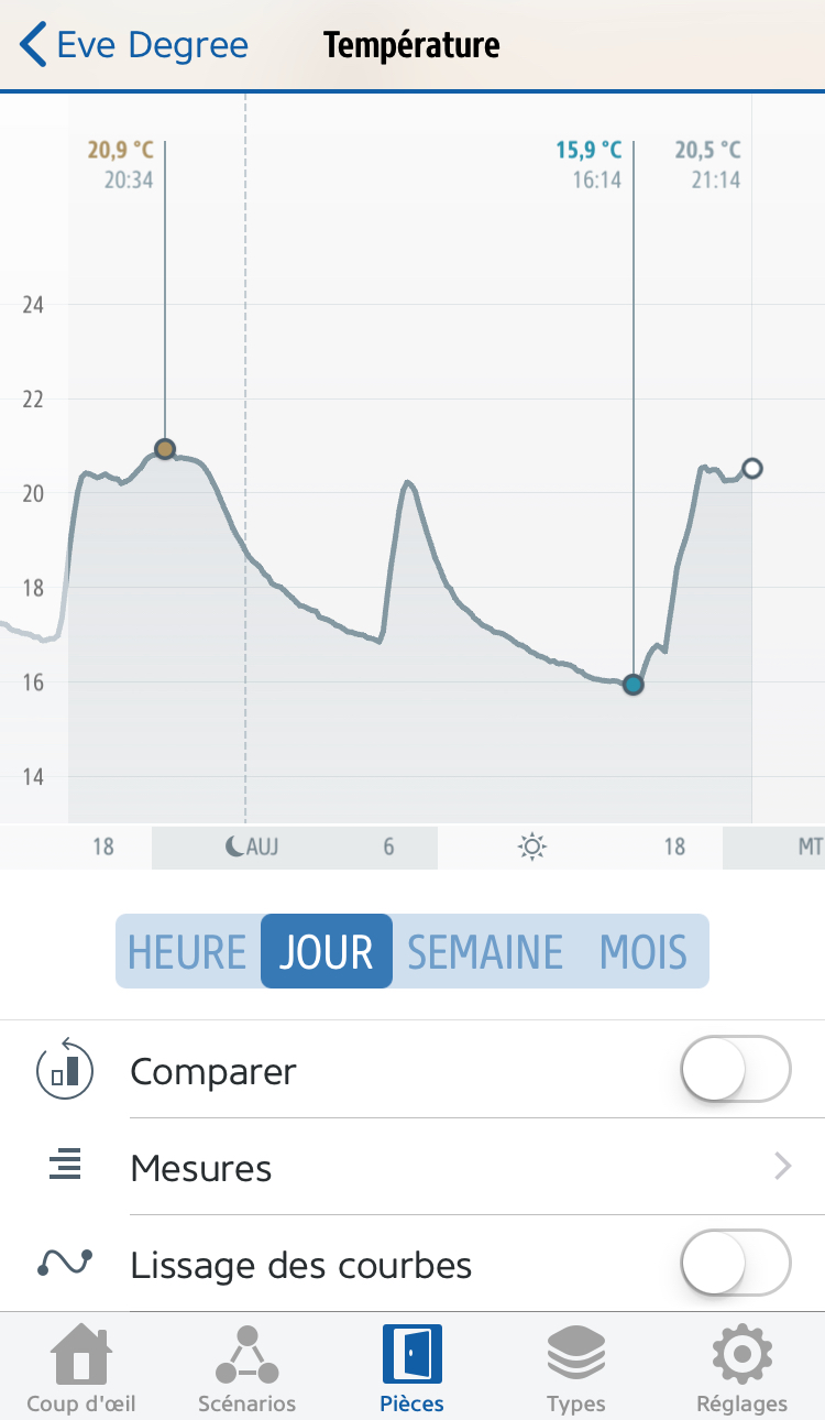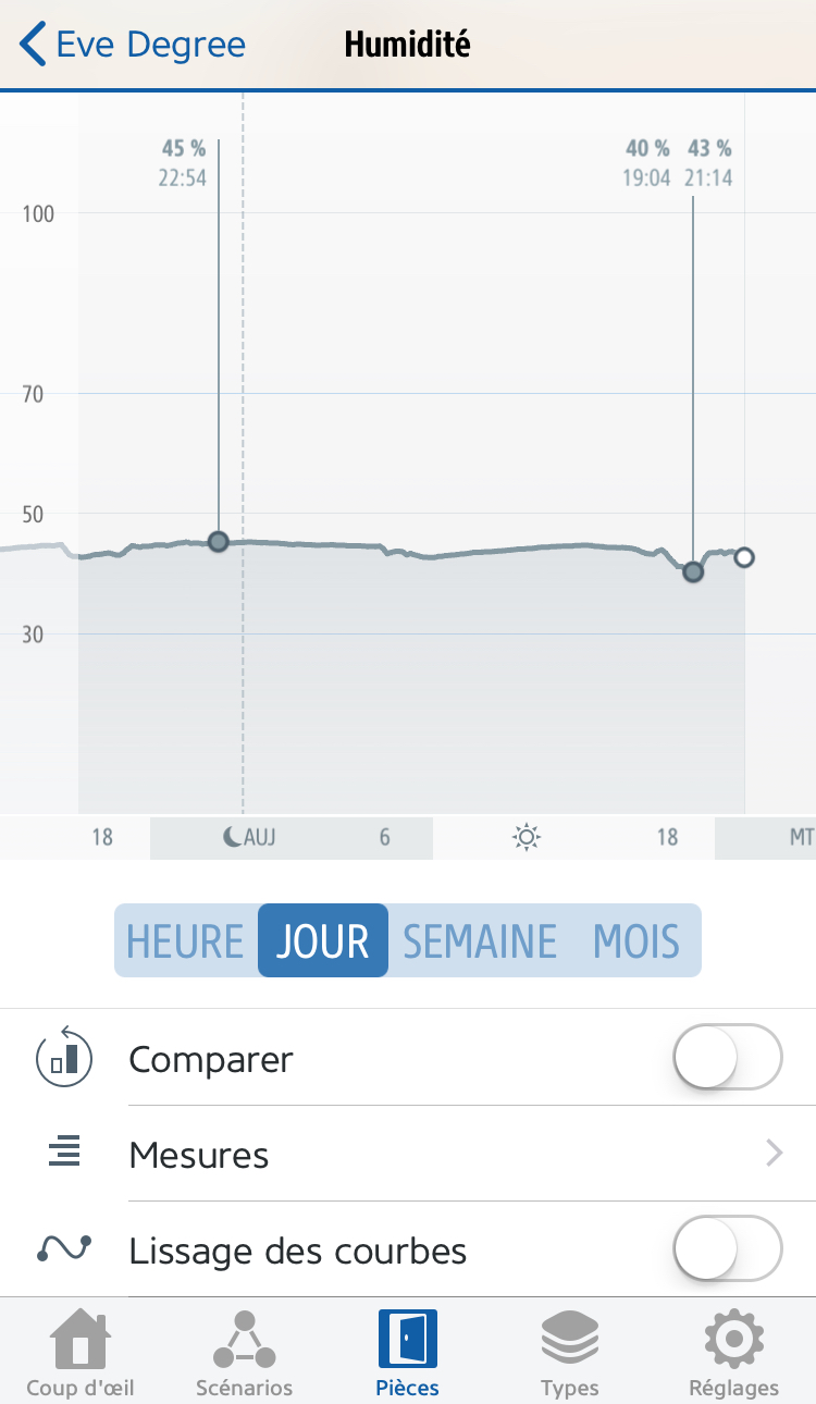 Eve Degree, de son petit nom commercial, vous permettra, en plus de connaître de manière précise et en temps réel la température et le taux d’humidité de la pièce où il se trouve, de collecter et d’analyser sous forme de graphiques des statistiques par jour, semaine ou mois dans le but d’améliorer votre qualité de vie et de gérer au mieux votre consommation d’énergie. Avec ce test, j’ai par exemple remarqué que le taux d’humidité de ma maison était beaucoup trop bas. J’ai pu directement rectifier le tir en équipant mes radiateurs d’humidificateurs d’air. Ouf, on respire !