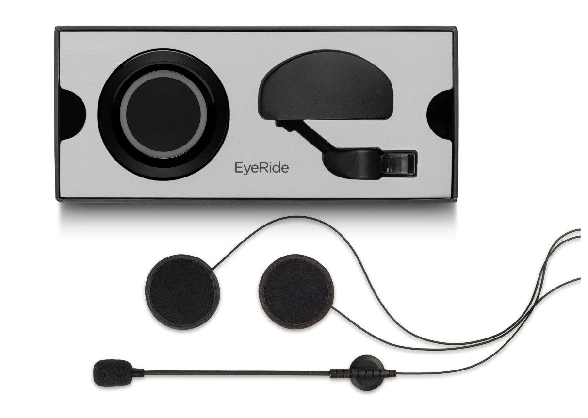 Compatible avec tous les smartphones, EyeRide est un affichage tête haute (Head-up display) qui s’installe facilement sur tous les casques du marché (intégral, convertible, jet). Une solution qui comprend : le module optique doté de la technologie exclusive EyeLights, et le kit audio (les écouteurs plats, plus le micro directionnel). Le tout est connecté avec l’application mobile dédiée, Captain Rider, qui fonctionne sur iOs et Android.