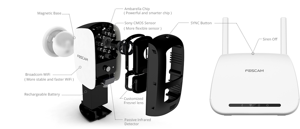 Sa grande particularité par rapport à la concurrence réside dans son installation 100% sans fil (à l’intérieur comme à l’extérieur) et dans sa batterie de 5000 mAh offrant une autonomie jusqu’à 6 mois (suivant paramètres et utilisation). L’état de la batterie est consultable à tous moments sur l’écran d’accueil de l’application et une notification vous sera envoyée lorsque son niveau de vie atteint les 20%. La Foscam se recharge comme un smartphone via son port USB.