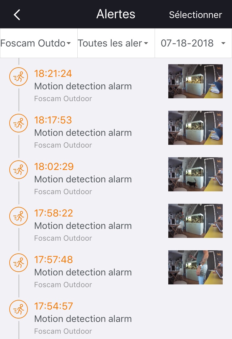 La Foscam E1 renvoie des images nettes et sans décalage même dans l’obscurité la plus totale. La détection de mouvement fonctionne très bien et dissocie clairement le passage des animaux à celui des êtres humains avant l’envoi d’une alerte push. Ces alertes peuvent d’ailleurs être consultées à tous moments dans un historique de l’application avec un lien direct vers les vidéos associées. Vous pourrez les activer/désactiver en quelques clics via le menu “paramètres” de la caméra.