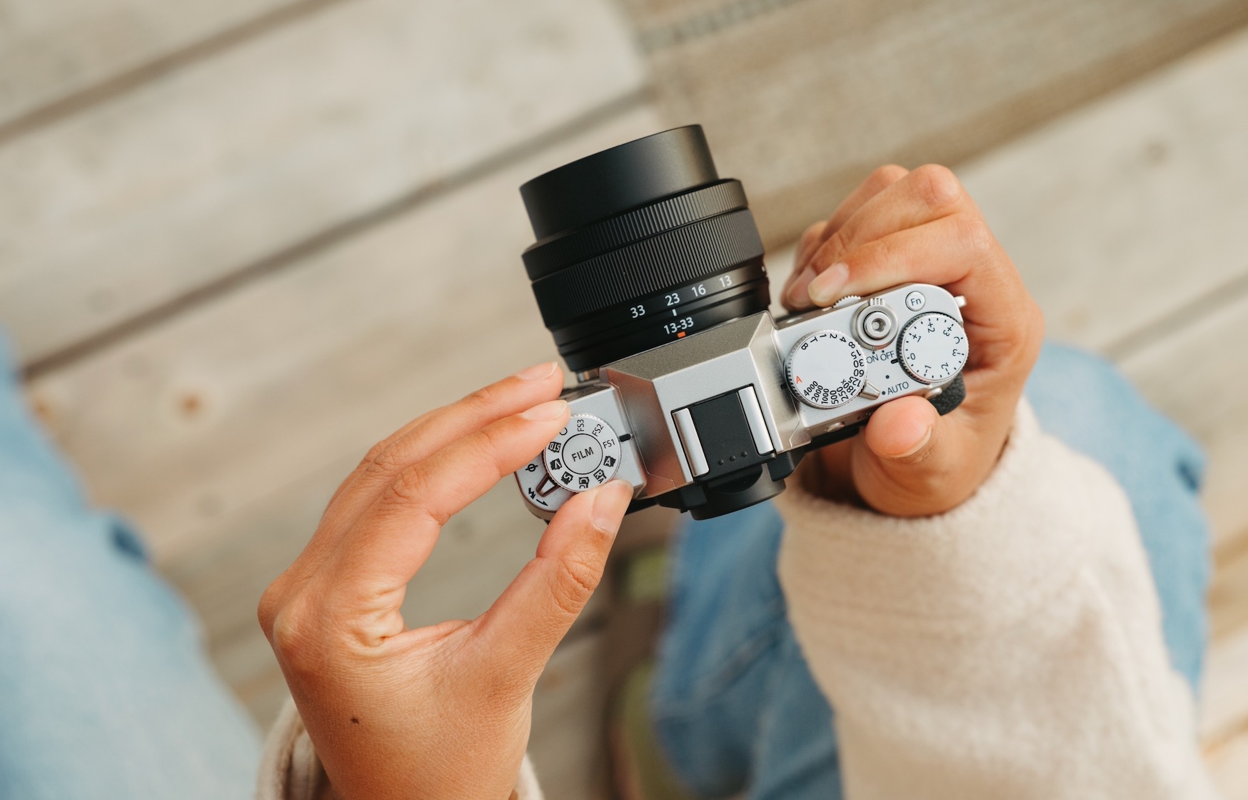 Molette intuitive sur le dessus de l’appareil avec 20 modes de simulation de films (dont « REALA ACE » et « NOSTALGIC Neg. »), trois emplacements FS Recipe personnalisables pour des styles photos personnalisés, permettant une expression créative sans limite.