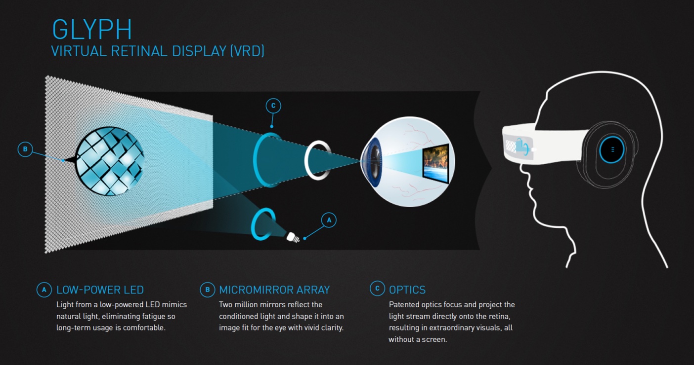 Le dispositif est en effet basé sur une matrice de millions de miroirs miniatures qui vont se charger de réfléchir la lumière générée par des LED. Ensuite, le faisceau lumineux est directement projeté dans la rétine, à travers vos yeux… et sans aucun danger pour ceux-ci. Chaque pixel est donc généré par un micro-miroir.