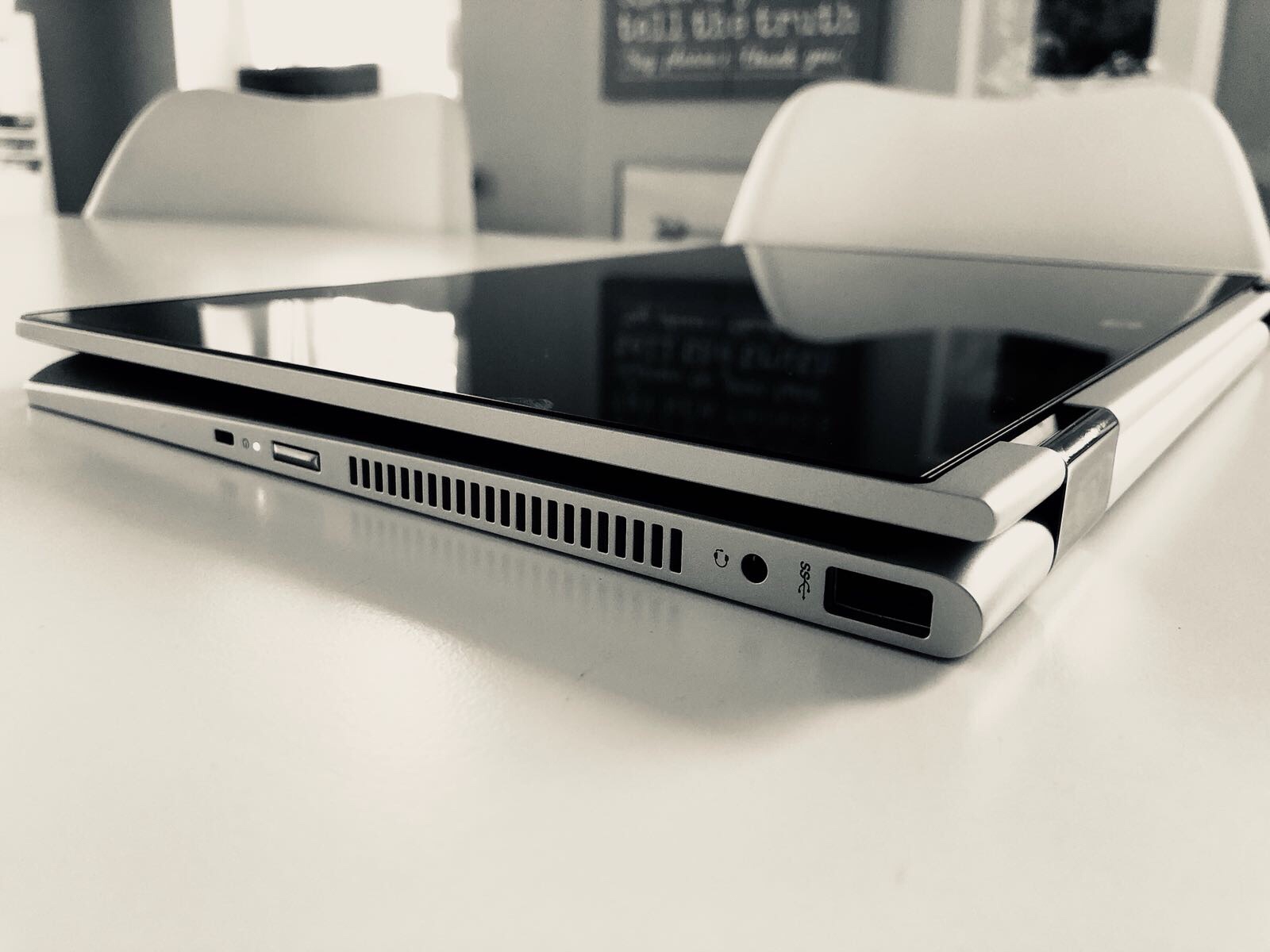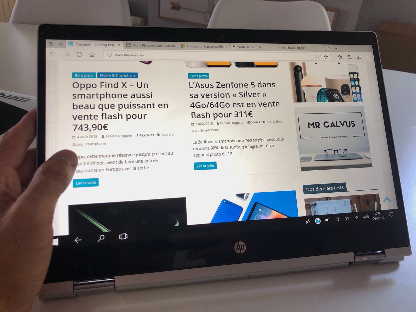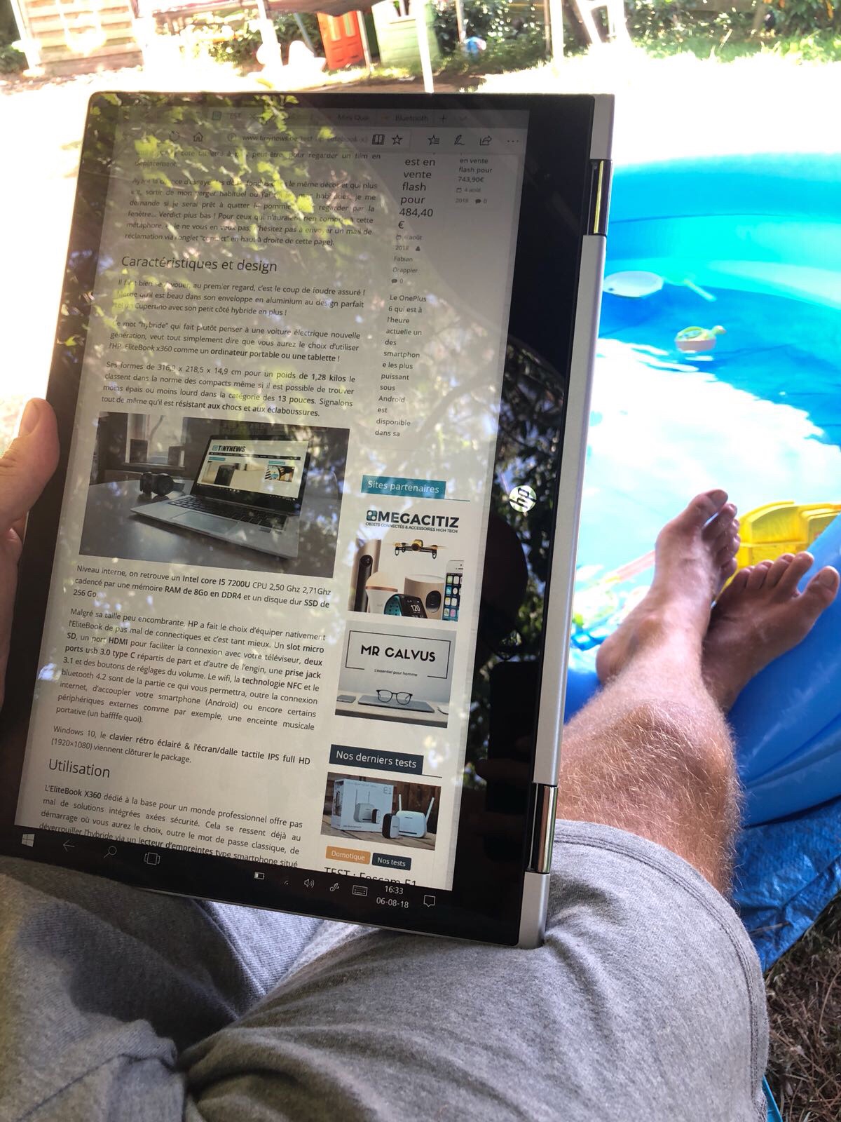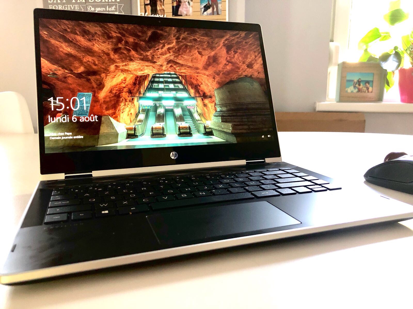 L’HP Pavillon X360 est agréable à l’utilisation tant au niveau du clavier que du touch-pad. Il est très simple de passer du mode “ordinateur traditionnel” vers le mode tablette en basculant l’écran à 360° grâce aux charnières dédiées. Moi qui n’était pas bon public dans le marché des tablettes mais plutôt casanier du clavier, j’avoue que pouvoir passer de l’un à l’autre, en fonction de mes occupations de la journée, est un gros plus auquel je m’habitue très vite. A force d’utilisation, je me suis même surpris en train de “scroller” l’écran alors que je travaillais en mode ‘ordinateur”. Au final, cela s’avère bien pratique pour modifier en un tour de doigts un Screenshot ou encore faire une prise de note rapide!