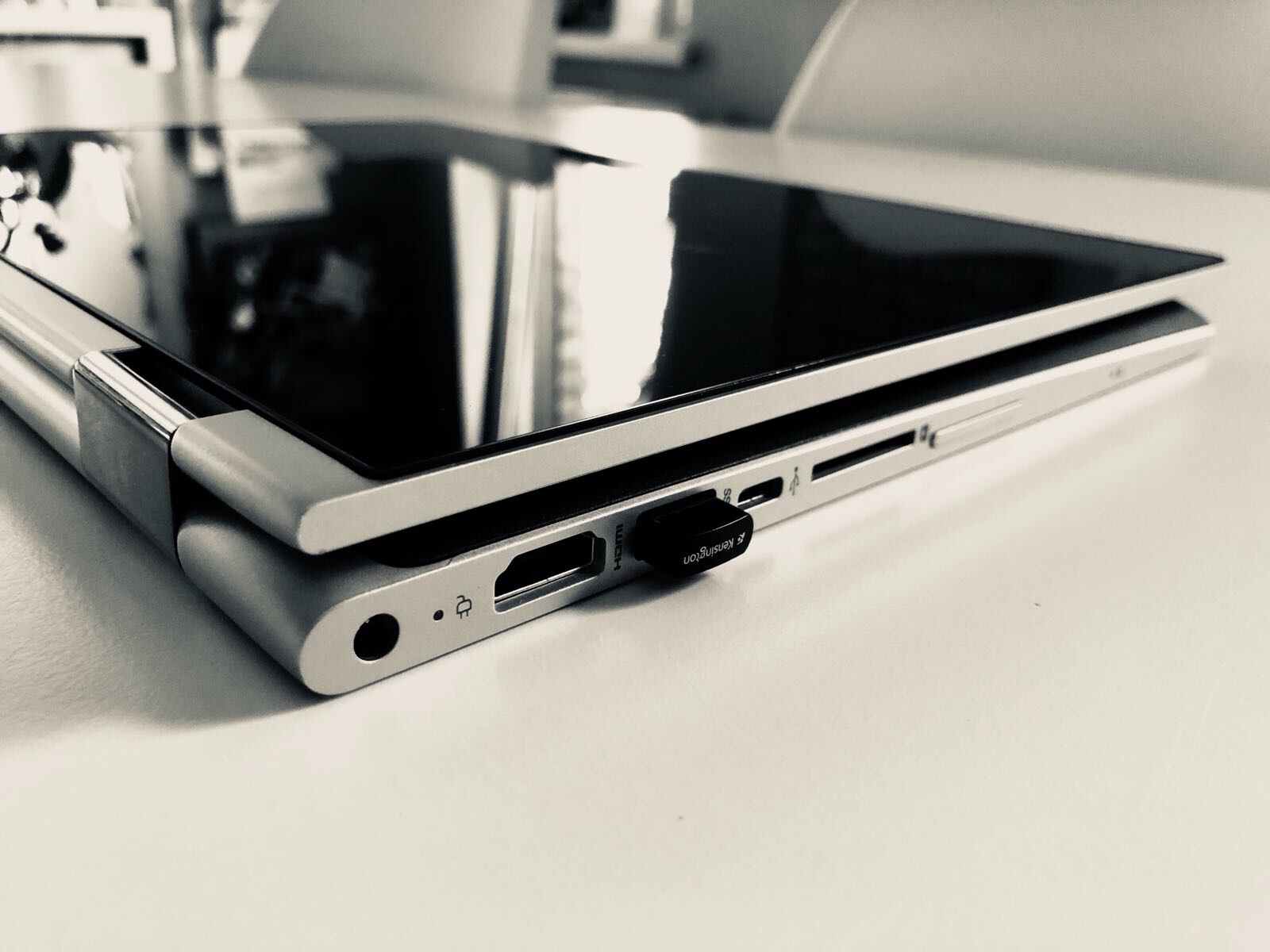 Niveau externe, même si au premier coup d’œil et ce malgré mon hypermétropie j’aurais juré voir de l’aluminium brossé, il n’en est rien… l’hybride dispose d’une enveloppe faite de plastique de bonne qualité, ce qui justifie déjà la différence de prix par rapport à l’Elitebook que nous avons eu l’occasion de tester il y a quelques semaines. Sur les côtés, on retrouve divers connectiques indispensables comme un lecteur de carte SD, un port HDMI, deux ports USB 3 + un USB type C , un bouton de gestion du volume et une prise jack.