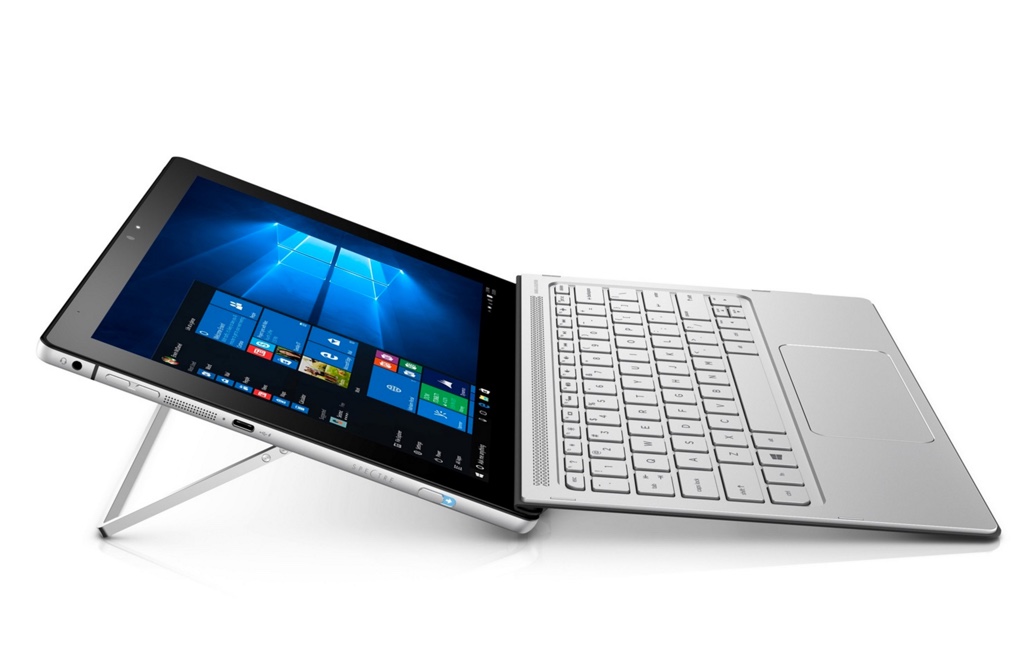 Soyons clair, avec ses 1.19 kg et sa finesse de 1.31 cm (base et écran compris), cet hybride en jette avec son design tout en aluminium. Il s’agit d’une tablette Windows 10, accompagnée d’un clavier amovible et d’une système de béquille afin de le maintenir en place sur le bureau (oubliez les genoux).