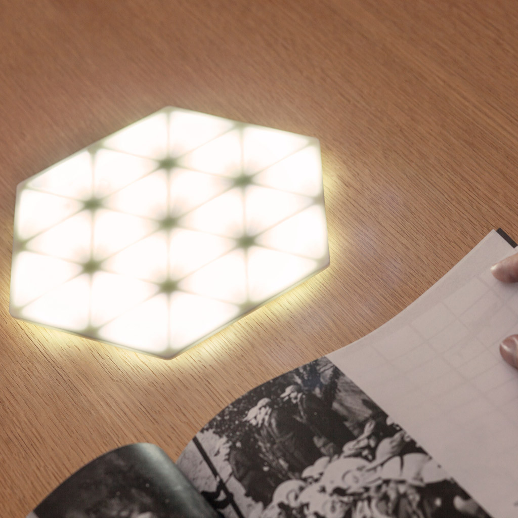Mais qu’est ce donc que cet espèce de frisbee lumineux ? Et bien, il s’agit d’un petit tapis hexagonal  en silicone qui renferme 24 LEDs basse consommation. Une petite batterie extra-plate offre une autonomie de 4 heures et est rechargeable via un simple cable microUSB.