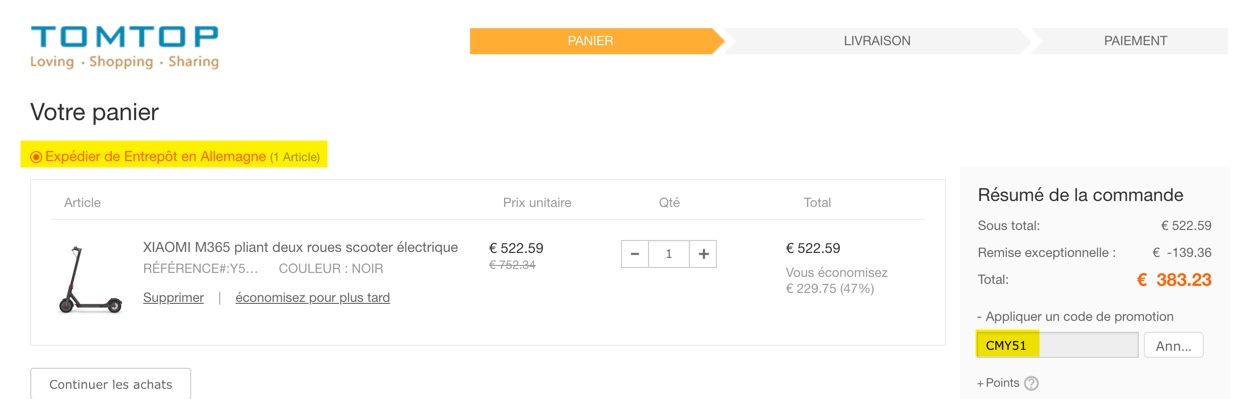 Actuellement en vente flash, cette délicieuse machine à roulettes est en vente sur chez TomTop, pour 383€, avec le code CMY51, livrable depuis leur entrepôt allemand et donc sans aucun frais de douane. Foncez !