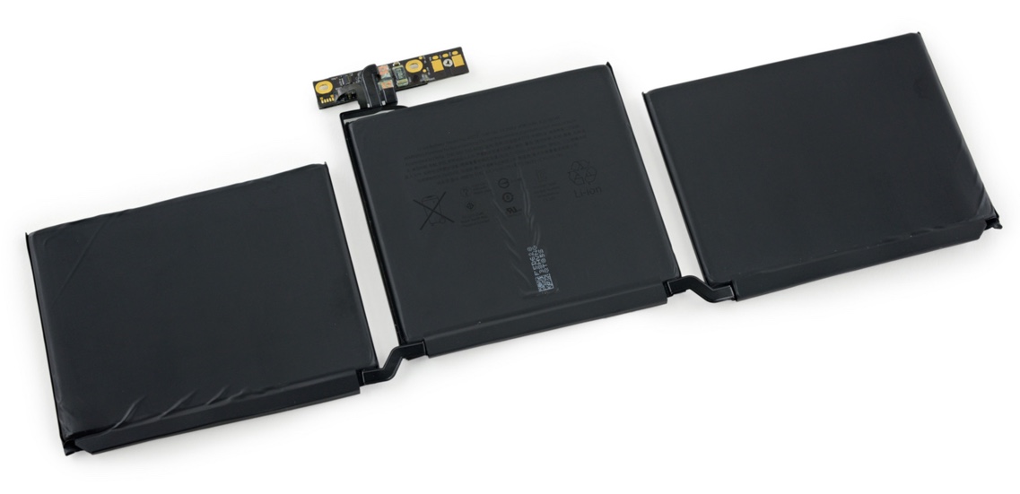 Déjà, et comme pour les versions précédentes des MacBooks Pro, tout est solidaire ou quasi. La mémoire est soudée à la carte mère, le SSD est soudé à une interface propriétaire, de sorte qu’il vous sera impossible de le remplacer sans passer par la case Apple. Côté batterie, celle-ci est directement collée à la coque. Là aussi, oubliez le remplacement standard, il vous faudra le rendre au fabricant pour l’échanger à grand coup de billet 100 Euros. A y regarder de plus près, cette batterie est en fait composée de trois parties distinctes, reliées par un câble et un petit contrôleur.