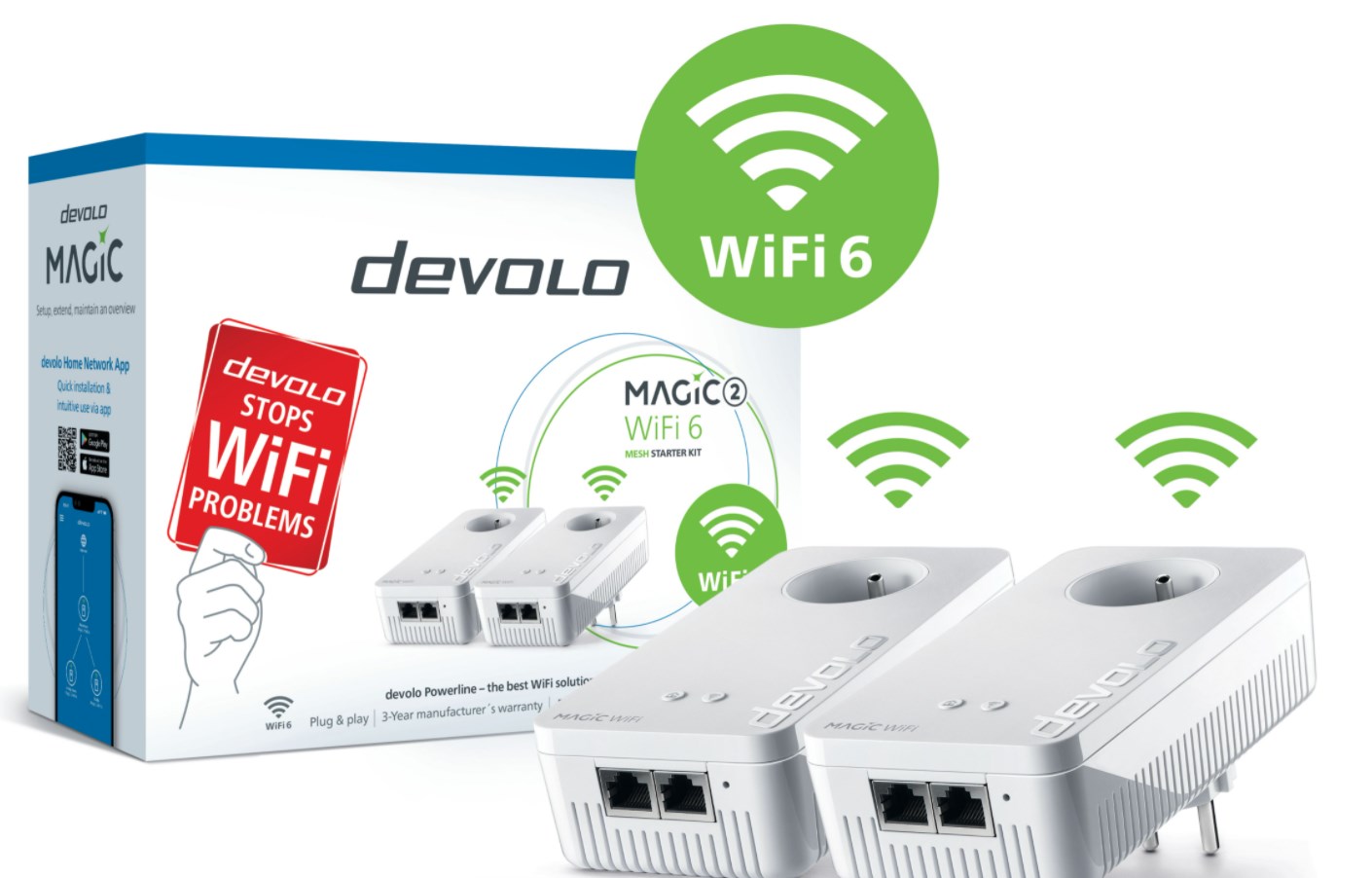 devolo Magic 2 WiFi 6 Mesh est maintenant disponible en deux variantes différentes : Le Starter Kit contient deux adaptateurs au prix de 349.90 euros. Pour couvrir de plus grands espaces de vie, le devolo Magic 2 WiFi 6 Mesh Multiroom Kit comprend trois adaptateurs au prix de 499.90 euros.