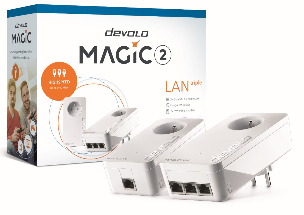 Le devolo Magic 2 LAN triple Starter Kit permet de configurer un nouveau réseau Magic. Le kit inclut un devolo Magic 2 LAN triple et un adaptateur devolo Magic 2 LAN, au prix de vente conseillé de 139,90 euros (TVA incluse). devolo offre une garantie constructeur de trois ans sur tous ses produits.