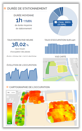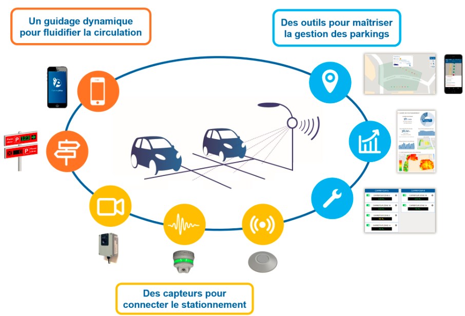 Des capteurs à analyse d’image transmettent en temps réel les informations d’occupation du parc de stationnement. Ils fournissent les données aux logiciels ParkingMap pour les différents services. Guidage à la place sur smartphone, indicateurs de mesures sur une application web, vision temps réel pour la régulation etc. Différents capteurs permettent de connecter le stationnement : détection par analyse d’image, détection par ultrasons et détection magnétique.