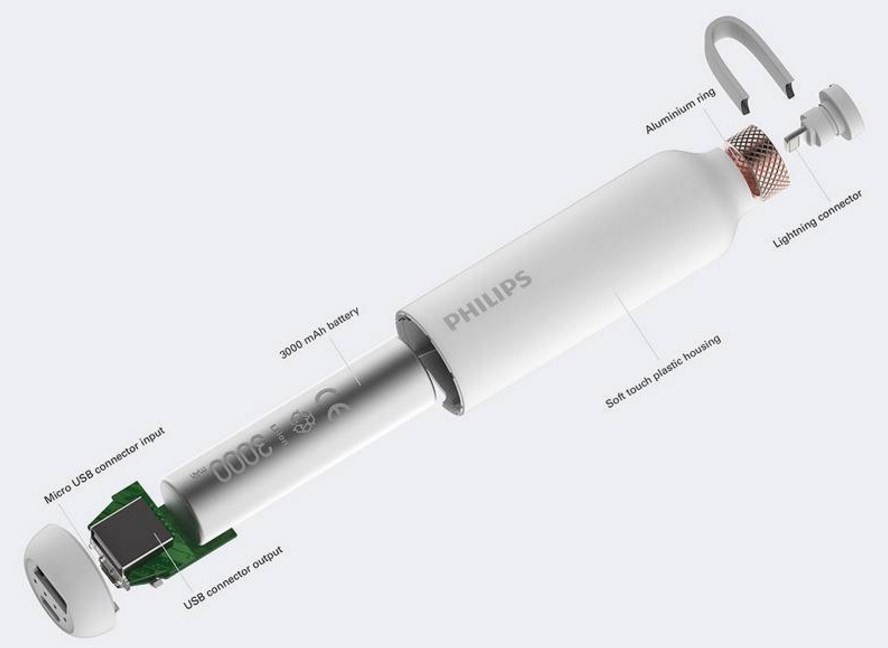 Evidemment, il n’est pas destiné qu’aux aficionados d”Apple : un port USB classique est aussi prévu dans la partie inférieure de la petite bouteille énergisante. Une petite LED indique aussi le niveau de charge. C’est fin, joli mais Philips n’a pas encore communiqué son prix. Cela ne s’aurait tarder.